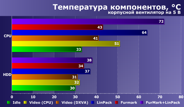Как наглядно видно из диаграмм, корпусной вентилятор приносит довольно мало пользы, хотя и работает при этом почти бесшумно. При необходимости его можно заменить на более производительную модель, особенно если речь идет об использовании пассивного охлаждения CPU.