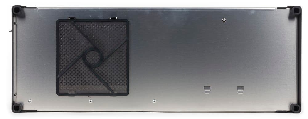 Нижняя стенка корпуса имеет натуральный цвет. В ее задней части находится перфорированная область, прикрытая сменным пылевым фильтром. Предполагается, что через эти отверстия будет получать холодный воздух вторая (нижняя) видеокарта. Высота алюминиевых ножек PC-V360 составляет чуть больше сантиметра. На все ножки установлены небольшие резиновые прокладки толщиной порядка 2-3 мм, благодаря которым корпус должен издавать меньше шума от вибраций, да и просто не царапать поверхность. На самом деле хотелось бы видеть бо́льшую толщину резины в ножках, имеющегося запаса может оказаться недостаточно.