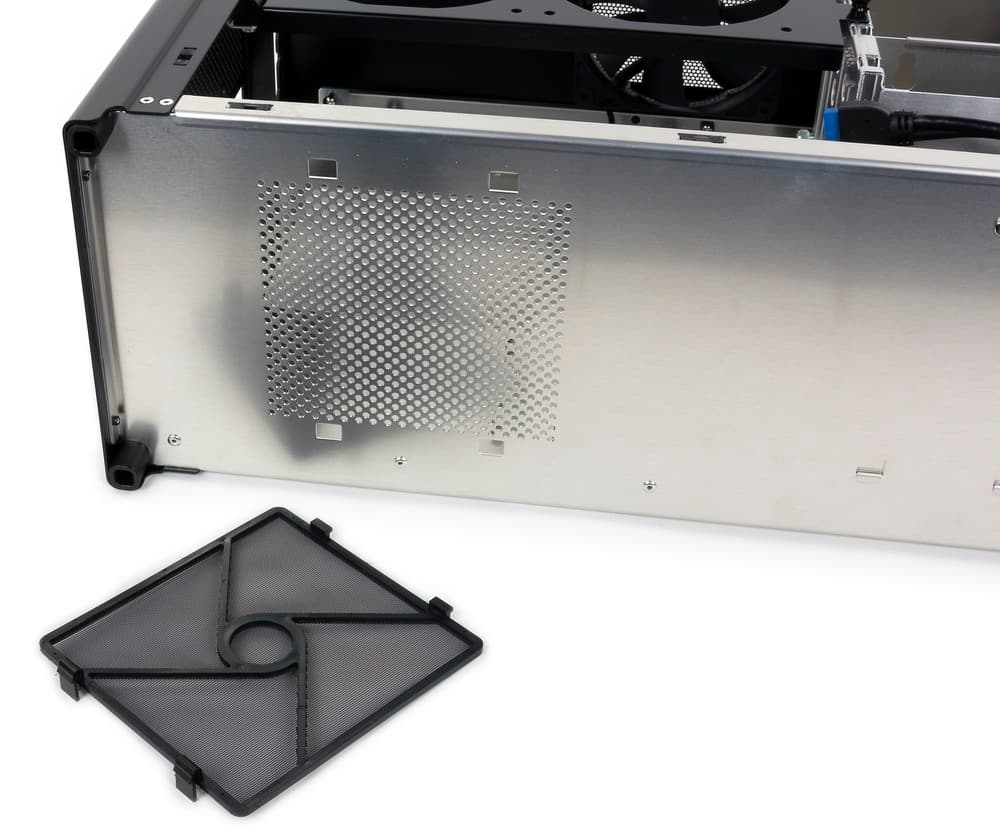 Последний, пятый вентилятор можно установить на задней стенке, но учитывая его скромный типоразмер (80 мм), желающих пойти на эту доработку должно быть совсем немного. Перфорация на нижней стенке корпуса призвана улучшить охлаждение графического адаптера, установленного в третий-четвертый слот системной платы. На внешней стороне нижней стенки расположен быстросъемный пылевой фильтр в пластиковой рамке, его можно без труда демонтировать и установить на место за считанные секунды.