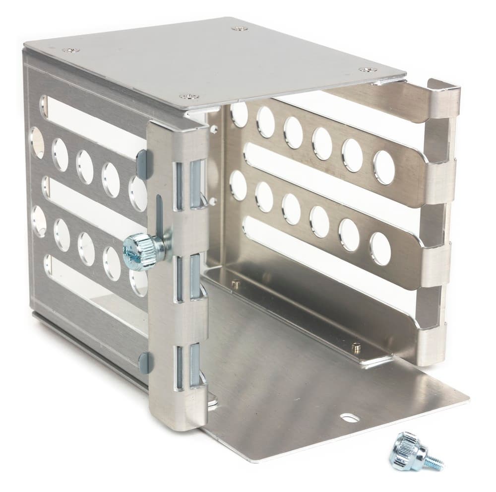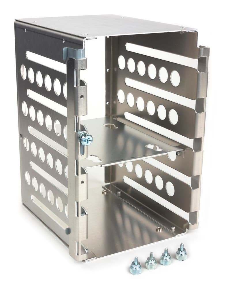 Установка HDD и SSD в данный корпус выполнена очень удобно: достаточно прикрутить к диску 4 винта с резиновыми амортизаторами и закатить его в свободное место соответствующей корзины. К 3,5″ дискам винты можно прикрутить руками, а в случае дисков ноутбучного формата все же придется прибегнуть к использованию отвертки. Диски достаточно плотно сидят в корзине, большие упругие амортизаторы хорошо подавляют вибрацию. Чтобы диск точно не выпал из корзины, нужно ослабить, опустить и снова зафиксировать вертикальную «щеколду», управляющуюся одним винтом с накатной головкой.