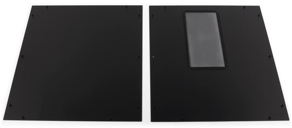 Правая боковая стенка абсолютно глухая, а на левой есть большой вырез со вставкой из металлической сетки. Размер и расположение выреза как раз совпадают с местом фиксации кронштейна для радиатора СВО. Примерно посередине верхней стенки расположен вырез под вытяжной вентилятор типоразмера 120 мм, также прикрытый металлической сеткой.