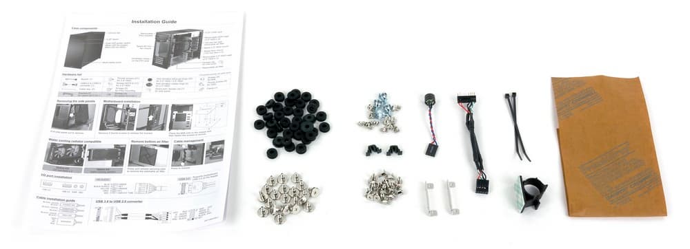 В комплект поставки помимо самого корпуса и элементов системы охлаждения входит инструкция формата А3 с большим количеством черно-белых фотографий, полный набор крепежных винтов и амортизирующих прокладок, несколько одноразовых стяжек, компактный спикер и переходник с колодки USB 3.0 на USB 2.0 для старых системных плат, не поддерживающих этот стандарт. Коробка PC-V360 ничем не примечательна, каких-либо ручек или прорезей для облегчения транспортировки на ней нет.