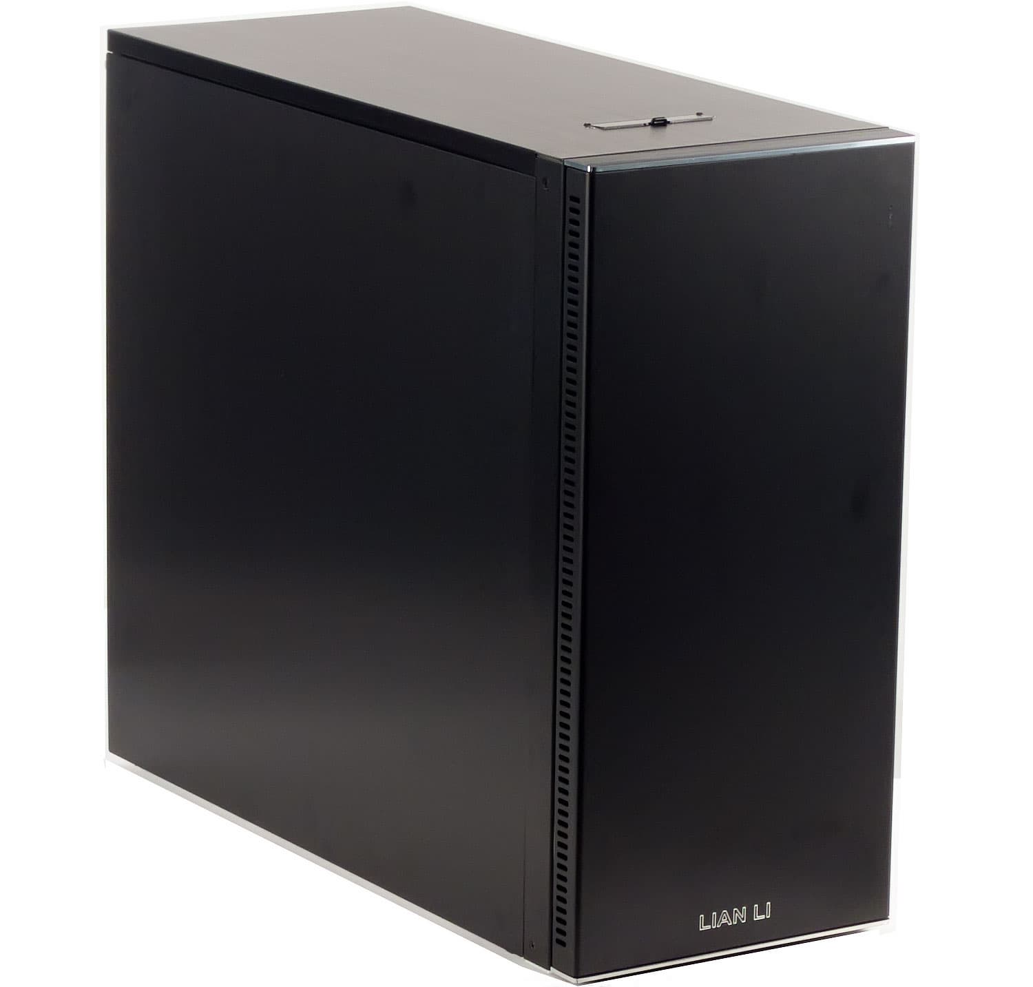 Верхняя панель корпуса имеет откровенно низкую жесткость, сравнимую с корпусами из стали толщиной 0,5-0,6 мм. Тут стоит отметить, что Lian Li B10 — это первый корпус с нижнерасположенным блоком питания (который попал к нам в руки), не имеющий вентиляционного отверстия на верхней панели. Судя по всему, такое техническое решение было применено осознано, с целью достижения эффекта максимального ослабления уровня шума от комплектующих, располагающихся внутри корпуса. Правда, отсутствие верхнего вентиляционного отверстия заметно ухудшает температурный режим компонентов, особенно в случае использования тихой и низкопроизводительной системы вентиляции корпуса.