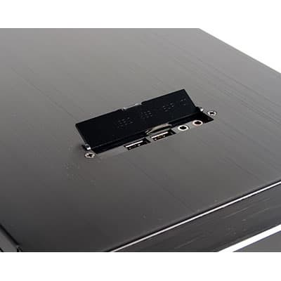 Фронтальные порты ввода-вывода расположены в передней части верхней панели корпуса. Подобное размещение портов наиболее удобно при напольном размещении корпуса. Номенклатура портов весьма скромна — присутствуют только разъемы USB, причем они размещены не лучшим образом — слишком скученно, и при использовании устройства с габаритной околоштекерной частью второй разъем окажется заблокированным.