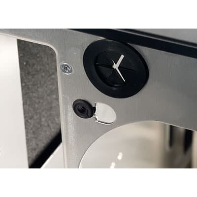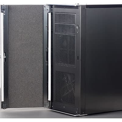 Переднюю панель корпуса закрывает декоративная дверь, выполняющая и задачу по шумоизоляции, так как практически вся фронтальная плоскость передней панели выполнена перфорированной. Дверь выполнена из двухмиллиметрового алюминиевого сплава, с внутренней стороны она оклеена слоем шумоизоляции толщиной около 3 мм, в роли которой выступает пористый синтетический материал, больше похожий на поролон, чем на синтепон или войлок. Фиксация двери в закрытом положении осуществляется при помощи шарового подпружиненного механизма, обеспечивающего достаточную силу фиксации для большинства случаев бытового применения.