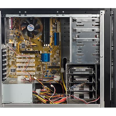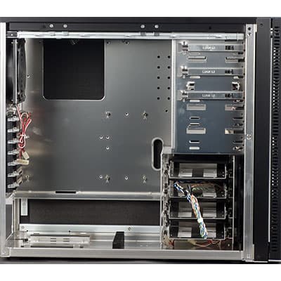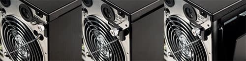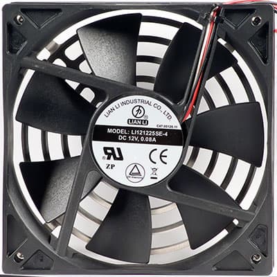 На передней стенке шасси корпуса установлены два вентилятора: типоразмера 140 мм с номинальной скоростью вращения около 950 оборотов в минуту и типоразмера 120 мм со скоростью вращения 1200 оборотов в минуту, их крепление выполнено стандартно — саморезами.