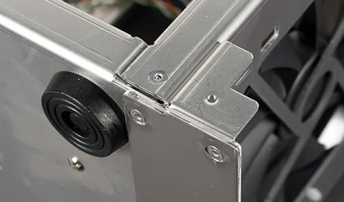 Следующим интересным решением является наличие уплотнителя по краю панели, выполненного резиновой лентой, что повышает качество прижима в месте контакта, и в теории устраняет возможный дребезг в зоне контакта боковой панели и шасси корпуса.