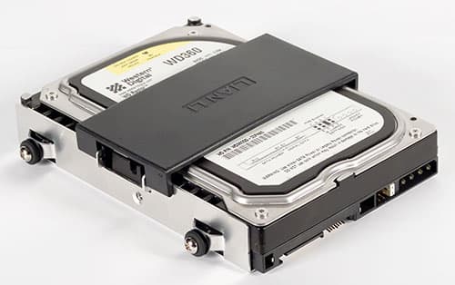 Для установки жестких дисков в данном корпусе используется безвинтовая система, основным элементом которой являются салазки, представляющие собой алюминиевый контейнер. Жесткий диск в данном контейнере держится не только за счет силы трения стенок, но и фиксируется двумя винтами (опционально). Правда, в нашем случае крепежные отверстия на контейнере немного не совпали.