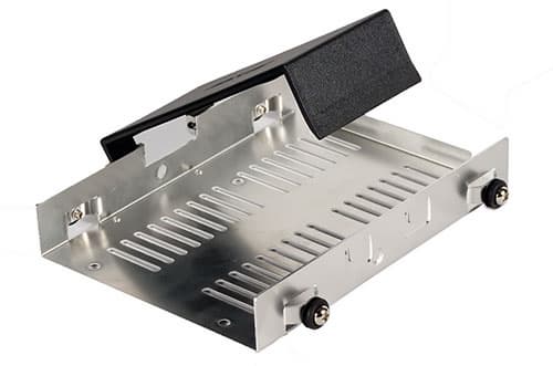 Выше мы описали процедуру установки в корпус жесткого диска типоразмера 3,5", но в данную модель можно также установить диски типоразмера 2,5". Для этого не потребуются какие-либо переходники, так как используется все тот же алюминиевый контейнер, куда по середине укладывается накопитель и фиксируется четырьмя винтами снизу. Вполне логичное решение.