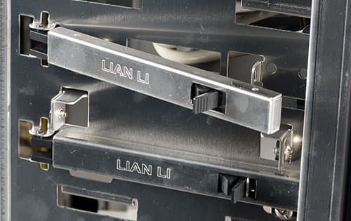 Боковые панели и все с ними связанное — это едва ли не самое интересное, что есть в данном корпусе. Их конструкция нетипична, так как вальцовка нижнего и верхнего края отсутствует в принципе — такое решение встречается не часто, тут можно вспомнить корпуса Hiper: Anubis и Osiris, где боковые панели имеют схожую конструкцию. Правда, в Lian Li B10 отличается метод крепления боковых панелей, в нижней части тут используется зацеп с фиксированной шириной зазора, тогда как в корпусах Hiper используется подпружиненный зажим, напоминающий по конструкции прищепку. Верхняя часть фиксируется запорным механизмом, напоминающим задвижку, прикрепленным к шасси корпуса. Тогда как в корпусах Hiper запорные механизмы располагались на самих панелях и представляли подпружиненные зацепы, перемещающиеся вертикально. Если оценивать удобство манипулирования боковыми панелями, то получаем примерный паритет, так как запорный механизм удобнее реализован в корпусе Lian Li, а механизм стыкования — в корпусах Hiper. Однако отличия не носят глобальный характер.