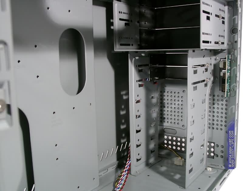 Как и в случае с предыдущими корпусами, имевшими по 2 посадочных места под 3,5 дюймовые диски, проблема, о которой в свое время упоминалось (установка жесткого диска с «навесным» вентилятором), сохраняется и без дополнительного навесного «кармана» поставить диски с вентилятором и без такового в корпус в базовом варианте не получится.