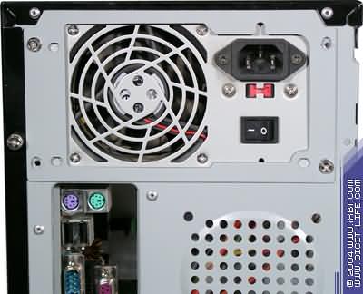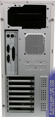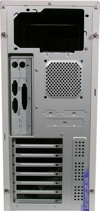 Задняя панель корпуса не отличается от задней панели большинства корпусов, представленных на рынке на сегодняшний день: отверстия под платы, устанавливаемые в слоты расширения системной платы, отверстия пассивной вентиляции, воздухозаборная решетка нагнетающего вентилятора и закрытая заглушкой прорезь под разъемы системной платы. От второго своего товарища, Comfo Black 885, модель отличается отсутствием крепежной скобы для блока питания — он крепится непосредственно к шасси. Обращает на себя внимание и прорезь под «ушко» для навесного замка, предотвращающего открытие корпуса — в левой (на фотографии — правой) боковой панели. Несмотря на то, что в предоставленной модели самого «ушка» не было, соответствующее углубление в шасси позволяет установить его в случае необходимости (в комплекте поставки крепежа не обнаружено).