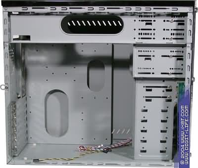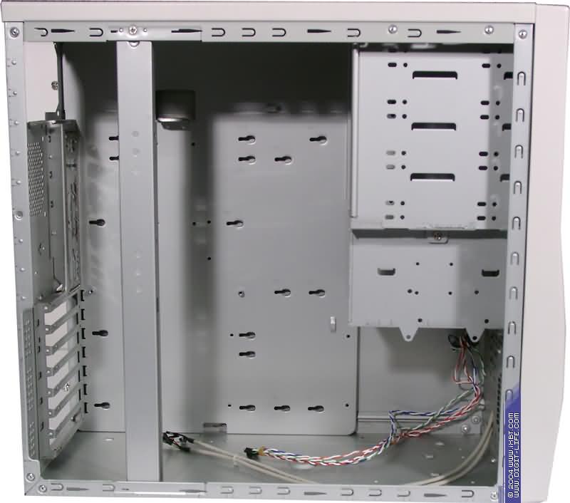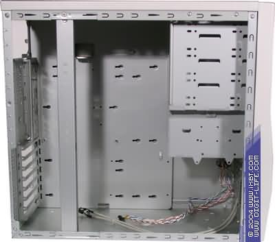 Как ясно из названия, тип шасси корпуса — 885, что подразумевает под собой помимо общих перечисленных технических характеристик наличие 4 внешних посадочных мест 5,25 дюйма и 2 внешних и 5 внутренних посадочных места под 3,5 дюймовые накопители. Согласно надписям, нанесенным на внутреннюю поверхность панели для крепления системных плат, корпус допускает установку плат форм-факторов P-4, ATX, Micro-ATX, AT.