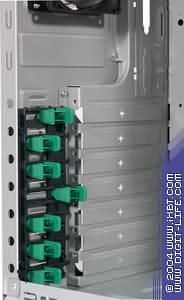 «Поддон» для крепления системной платы съемный, он крепится к шасси путем 2 винтов, которые «замаскированы» частью второй боковой панели, в месте ее крепления к задней панели. Достаточно интересен механизм установки и крепления плат расширения системной платы: при помощи пластиковых крепежей-защелок, выполненных из достаточно толстого пластика. После выламывания заглушек на задней панели плата расширения «досылается» в паз защелкой и фиксируется.