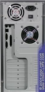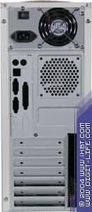 Задняя панель имеет стандартный вид — прорезь под разъемы ввода/вывода системной платы, прикрытая заглушкой (она крепится к шасси винтом, что исключает вероятность ее выпадения, например, при транспортировке), отверстия для пассивной вентиляции, прорезь под вентилятор (в корпусе по умолчанию установлен 80-мм вытяжной вентилятор). Все кромки панелей сглажены, крепление верхней панели к шасси осуществляется заклепками.