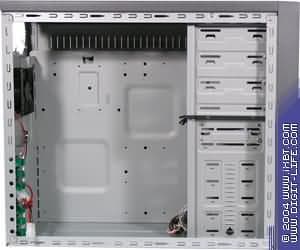 Стандартное размещение компонентов: жестко зафиксированные посадочные места под жесткие диски, поддон для крепления системной платы. В передней части предусмотрены посадочные места под крепления двух вентиляторов, которые могут использоваться не только для создания должного тока воздуха внутри, но и обдувать жесткие диски, так что, похоже, можно обойтись и без «навесных» кулеров НЖМД.