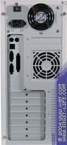 На боковых панелях предусмотрено по два ряда отверстий для пассивной вентиляции. Задняя панель (несмотря на уменьшенные размеры) полностью соответствует требованиям к типоразмеру Midi Tower: 7 разъемов под выходы плат расширения системной платы, стандартная прорезъ под разъемы ввода/вывода системной платы, вентиляционное отверстие 80-мм вентилятора (в комплект поставки не входит).