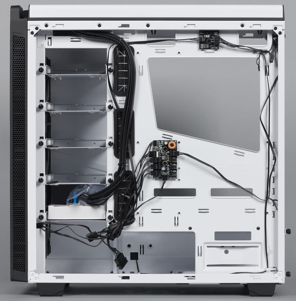 В белый цвет окрашены и все внутренности, исключая лишь некоторые детали вроде заглушек слотов расширения или рамок вентиляторов. Акриловая вставка в левом боковом окне тонированная, но лишь слегка, и не выделяется темным пятном.