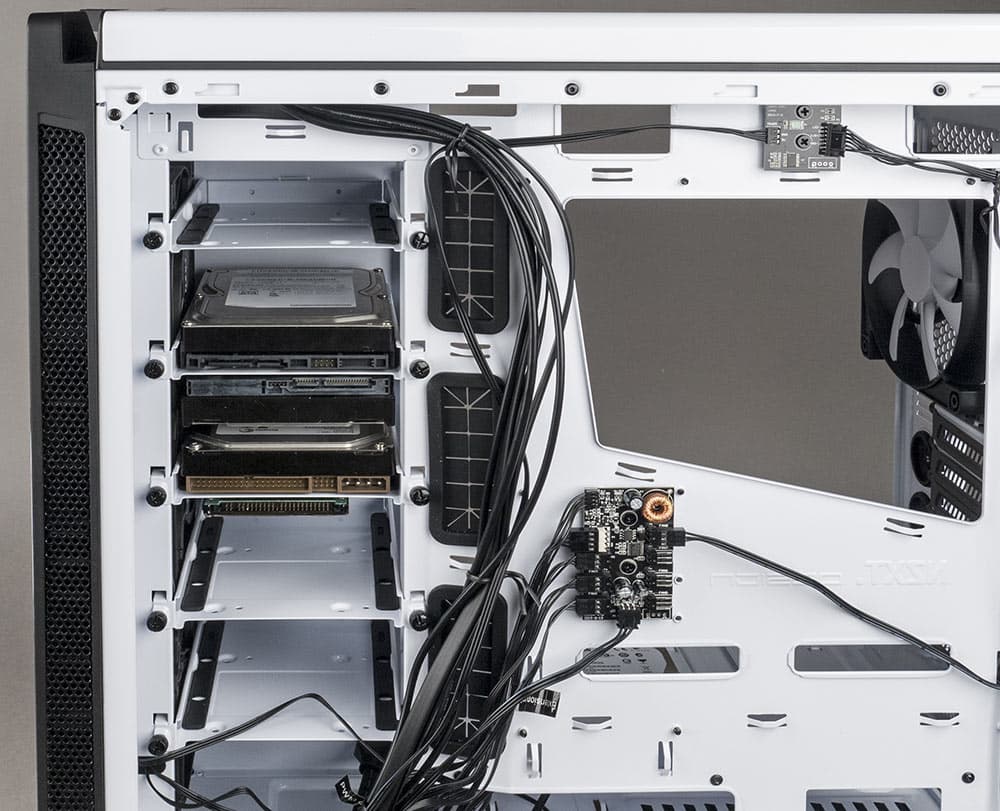 Корпус оснащен одноканальным контроллером вентиляторов, который может управлять семью вентиляторами одновременно, а также имеет дополнительный неуправлямый четырехконтактный выход для подключения процессорного кулера. Питание контроллера осуществляется от периферийного разъема (молекс) двумя номиналами питающего напряжения: 5 В и 12 В. При подаче только 12 В контроллер регулировать выходное напряжение на разъемах не будет, а вентиляторы будут вращаться на максимальных оборотах. У данного контроллера отсутствует орган управления, который доступен для пользователя, а изменение выходного напряжения происходит в зависимости от сигнала по каналу ШИМ-управления процессорного кулера (коэффициента заполнения ШИМ), который подается на вход контроллера через соответствующий разъем.