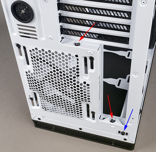Установочные отверстия позволяют использовать и другие размеры: так, задний вентилятор можно заменить 120-миллиметровым, а три передних — двумя по 140 мм. Еще два 140-мм или три 120-мм можно разместить на верхней плоскости шасси, каких-либо других мест для вентиляторов не предусмотрено, то есть всего их может быть не более семи.