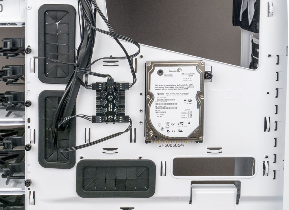 В корпусе есть встроенный контроллер, позволяющий подключать до 10 вентиляторов. Упоминавшийся при описании панели управления переключатель позволяет выбрать одну из трех скоростей вращения, а питание подается с помощью периферийного разъема («Molex» male), общего для контроллера вентиляторов и задней подсветки.