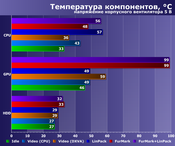 Результаты показывают, что перевод корпусного вентилятора в тихий режим не только делает компьютер тише, но и значительно повышает температуру основных компонентов во всех режимах использования.