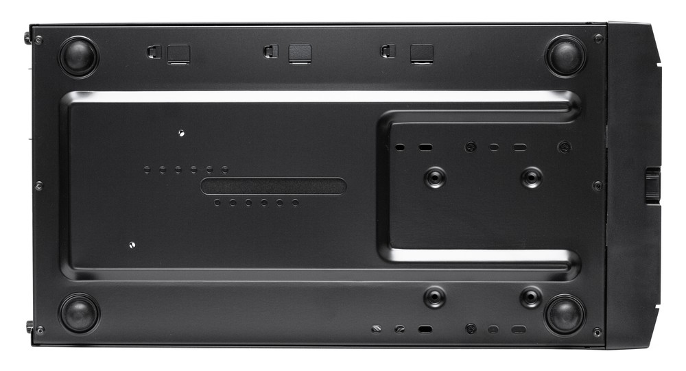 Ножки изготовлены из достаточно мягкой резины, так что можно рассчитывать на определенный амортизирующий эффект. На твердой поверхности корпус стоит уверенно, не скользит во время установки и извлечения USB-устройств. Приток воздуха с нижней стенки корпусу не нужен, так как блок питания находится наверху, а посадочных мест для корпусных вентиляторов на нижней стенке Kublai KL06 не предусмотрено.