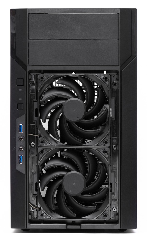 В комплекте с SilverStone Kublai KL06 поставляются два вентилятора типоразмера 120 мм, которые предустановлены на передней стенке шасси и работают в нагнетающем режиме. Их воздушный поток в той или иной степени охватывает все комплектующие: обе платы расширения, корзину для дисковых накопителей и процессорный кулер. Впрочем, если отсек для дисков забить достаточно плотно, то до процессора воздушный поток если и дойдет, то в значительно ослабевшем виде.