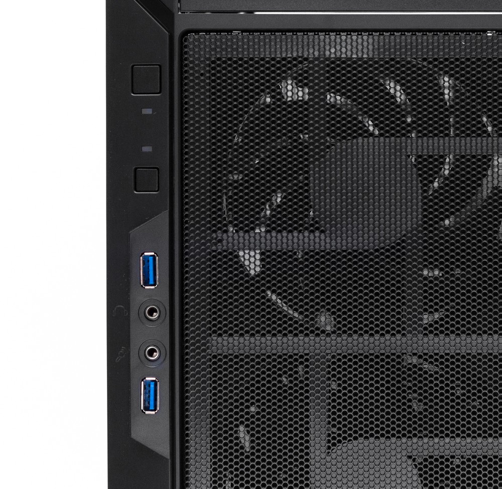 Ниже элементов управления находятся два порта USB 3.0, а также разъемы для подключения микрофона и наушников. Порты USB разнесены друг от друга, так что проблем с одновременным подключением двух габаритных устройств возникать не должно. Размещение самой панели управления делает одинаково удобным использование ее органов как при настольном, так и при напольном размещении компьютера.