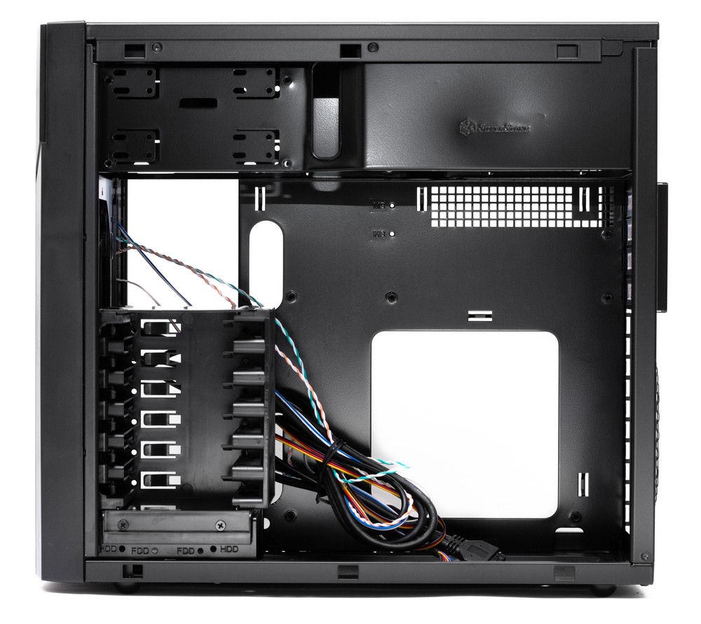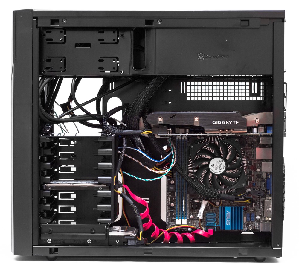 Такой подход к построению шасси не нов, его можно встретить в том числе и у других производителей компьютерных корпусов, однако большого распространения он и не получил. Если бы шасси корпуса было построено по ставшей уже привычной схеме с нижнерасположенным блоком питания, то работать с ним было бы проще и приятнее, а охлаждение стало бы хуже разве что в случае установки корпуса на ковер с очень высоким ворсом, который бы лишал блок питания нормальной циркуляции воздуха. С другой стороны, при таком расположении комплектующих можно уместить высокий кулер и длинные видеокарты в чуть более компактном по высоте корпусе — быть может, именно этого и добивались проектировщики из SilverStone.