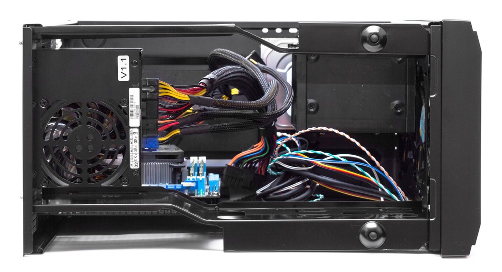 Системная плата устанавливается процессорным кулером вниз, а слотами расширения, соответственно, вверх. При этом основание системной платы находится у левой боковой стенки, а снимать для обслуживания ПК нужно в первую очередь правую. Если собирать компьютеры редко, то такое расположение не должно вызывать негативных эмоций. Зато сборщиков со стажем такая конструкция шасси почти наверняка заставит сделать несколько ошибочных действий. Например, снять не ту боковую стенку, открутить верхние заглушки для установки первой видеокарты вместо нижних, поставить заглушку задних портов ввода/вывода вверх ногами и так далее.