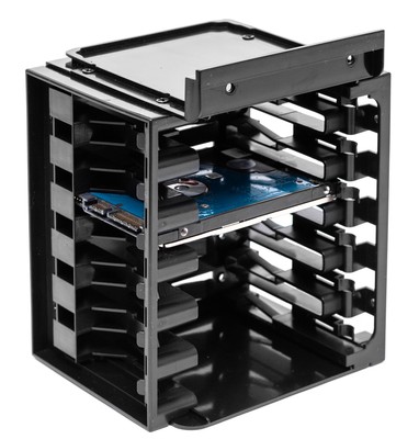 Пластиковая корзина предусматривает установку 6 накопителей 2,5″ формата, она крепится двумя винтами к передней стенке корпуса и еще двумя — к нижнему отсеку для установки 3,5″ накопителя. Диски ноутбучного формата достаточно просто вставить в корзину по направляющим до характерного щелчка пластиковой защелки. Для извлечения дисков нужно отжать защелку и потянуть накопитель на себя. Крепление получается не самым надежным, но если учитывать, что SSD не вибрируют во время работы, а ставить в настольный компьютер 2,5″ ноутбучные жесткие диски — занятие мало популярное, то придираться к надежности фиксации нет никакого смысла.