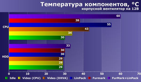 Заметим, что в протестированном нами ранее Milo ML05 корпусной вентилятор отсутствовал, что приводило к увеличению температуры CPU и HDD примерно на 10 градусов в самых нагруженных режимах.