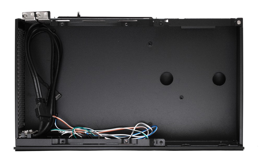 Корпус представляет собой однообъемную конструкцию, в которой все комплектующие находятся в пределах одной плоскости. Объем корпуса крайне мал, поэтому его внутреннее пространство предусматривает установку только системной платы формата Mini-ITX, небольшой корзины на 4 накопителя ноутбучного формата и блока питания стандарта SFX глубиной до 100 мм.