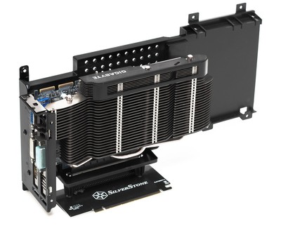 Видеокарта не вставляется напрямую в системную плату. В этом корпусе для ее установки используется Г-образный рэйзер, позволяющий установить графический ускоритель в той же плоскости, что и основная плата. А это, в свою очередь, сокращает минимально необходимую высоту всей конструкции в целом. Точно такой же прием уже очень давно применяется в 1- и 2-юнитовых серверах для установки плат расширения в условиях корпуса с сильно ограниченной высотой.