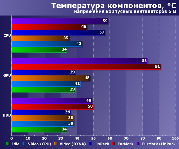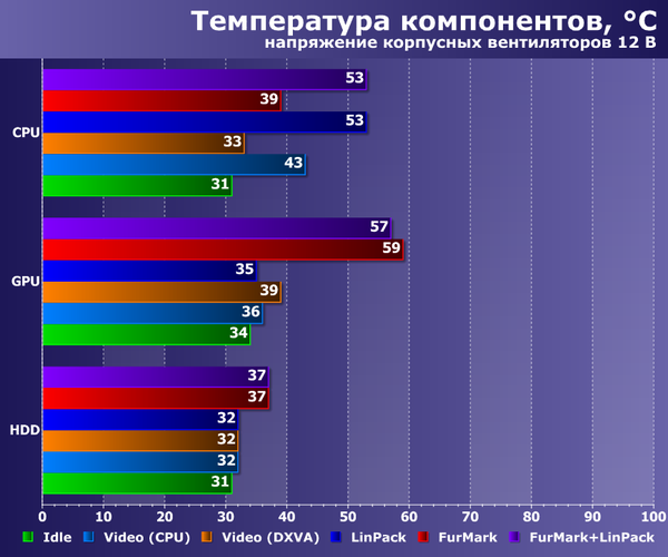 А вот переключать вентиляторы на «диетическое» 5-вольтовое питание нужно с большой осторожностью. Если для режима простоя и просмотра видео такой вариант более-менее подходит, то в режиме высокой нагрузки температуры жесткого диска и графического ускорителя оказываются далеки от рекомендуемых для долговременной работы значений. К тому же комплектные вентиляторы не всегда стартуют от столь низкого напряжения, периодически их приходится подтолкнуть руками, что для рабочей (не тестовой) системы неприемлемо.