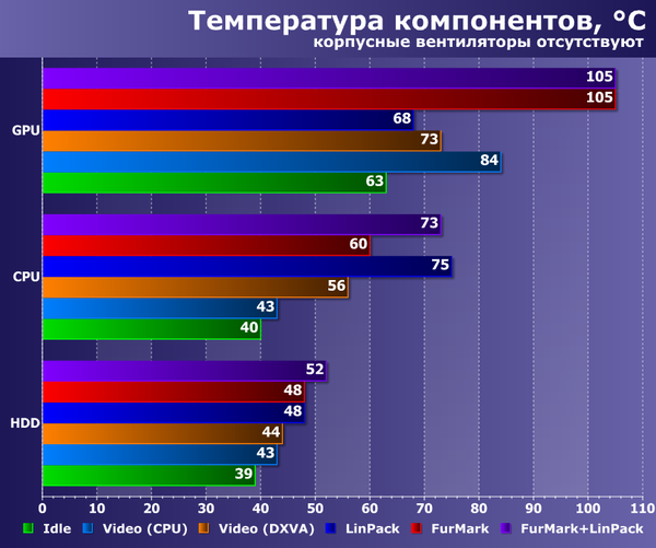 Отметим, что во время проведения всех тестов корпус был установлен в вертикальном положении, приток воздуха к боковым стенкам затруднен не был. Результаты тестов представлены на диаграммах: