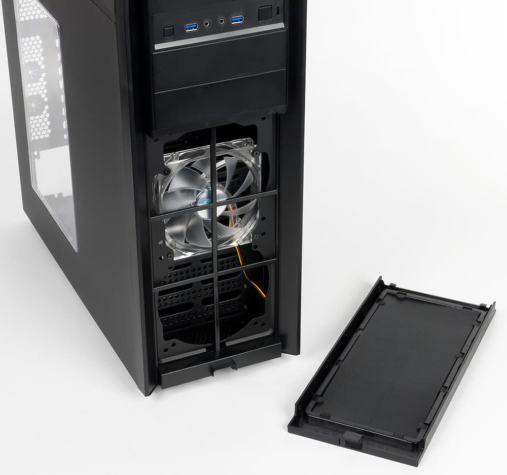 Несмотря на бюджетную цену, система фильтрации поступающего воздуха на удивление полная: фильтрами оснащены все области с отверстиями (спереди, сверху, снизу), кроме, понятно, задней стенки — устанавливаемый на ней вентилятор обычно бывает вытяжным.