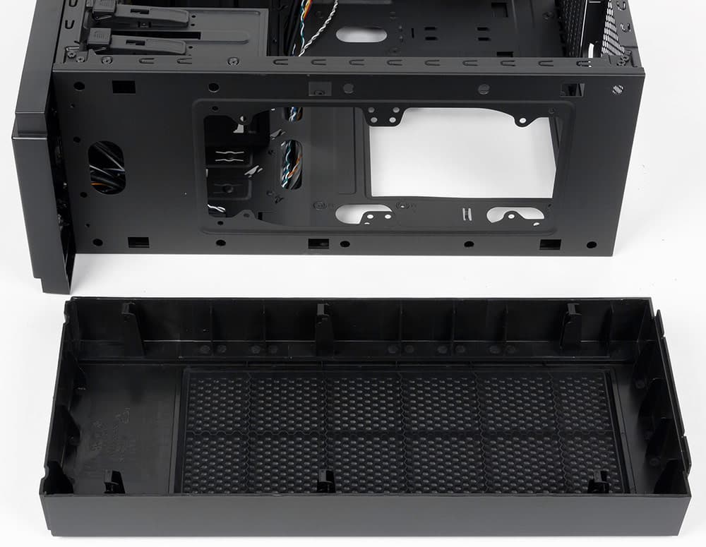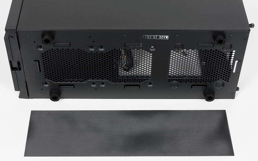 Нижний фильтр такой же, как и фронтальный — тонкий пластиковый лист с мелкими отверстиями. Вот только крепится он без всяких рамок: лист просто вставляется снаружи в штампованные выступы днища. Решение вполне эффективное, хотя и не очень практичное в плане обслуживания: чтобы достать или вернуть на место фильтр, компьютер придется класть на бок или хотя бы сильно наклонять, без этого места крепления фильтра попросту не увидишь, а работать наощупь получится вряд ли.