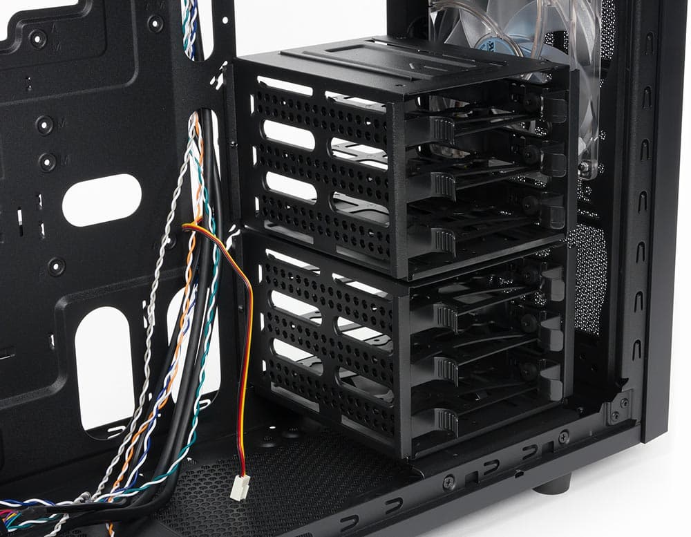 - обе прикреплены к пятидюймовому отсеку, одна под другой, что даст возможность установить на днище корпуса под корзинами дополнительный вентилятор (но придется снять упомянутый подиум, который крепится четырьмя винтами);