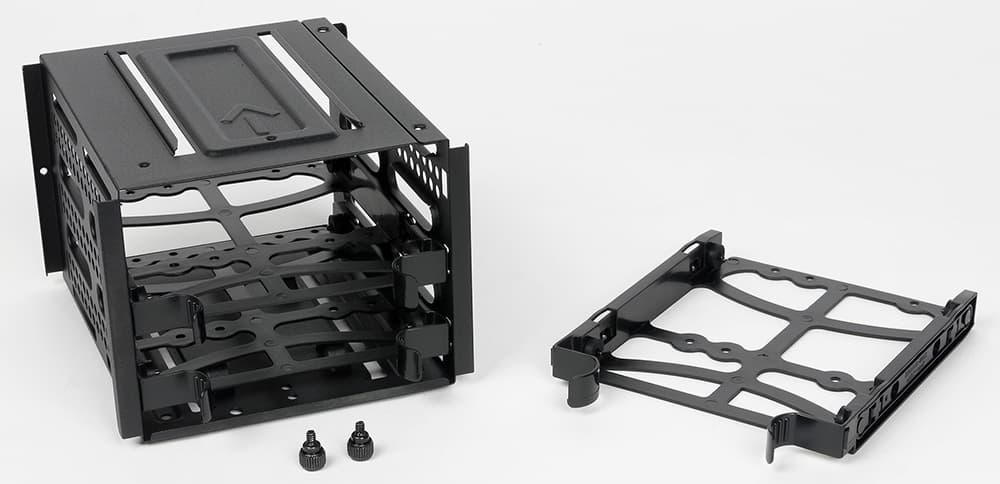 Дисковые корзины сверху и снизу имеют пазы и выступы, позволяющие соединять их с основанием, пятидюймовым слотом, а также друг с другом. Но, конечно, подобное крепление было бы недостаточным, если бы не предусмотренная с правой стороны фиксация парами винтов с накатными головками — соответствующие отверстия в шасси имеются для каждого из трех возможных положений.