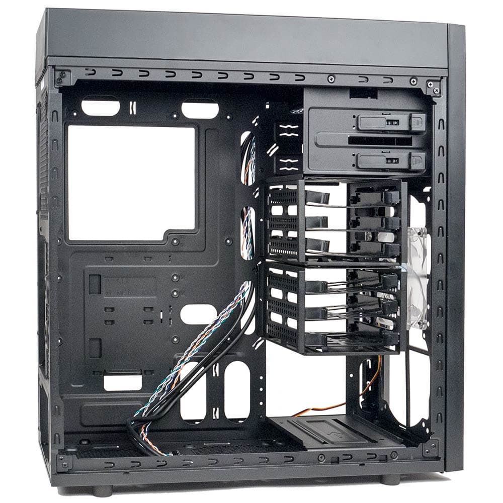 Корпус укомплектован единственным 120-миллиметровым вентилятором, установленным на фронтальной стенке шасси и нагнетающим воздух внутрь через сетку лицевой панели. При нижнем расположении обеих корзин он будет создавать дополнительное охлаждение для двух накопителей в верхней из них и частично для третьего, а примерно половина создаваемого им потока достанется системной плате. Если корзины установлены по схеме «одна внизу, одна вверху», то один накопитель в верхней корзине будет охлаждаться полностью, второй частично, и половина потока от вентилятора будет работать на дополнительное охлаждение видеокарт. Если обе корзины расположены вверху, то штатный вентилятор будет работать только на накопители — все они, полностью или частично, окажутся в потоке воздуха от него, исключая лишь самый верхний.