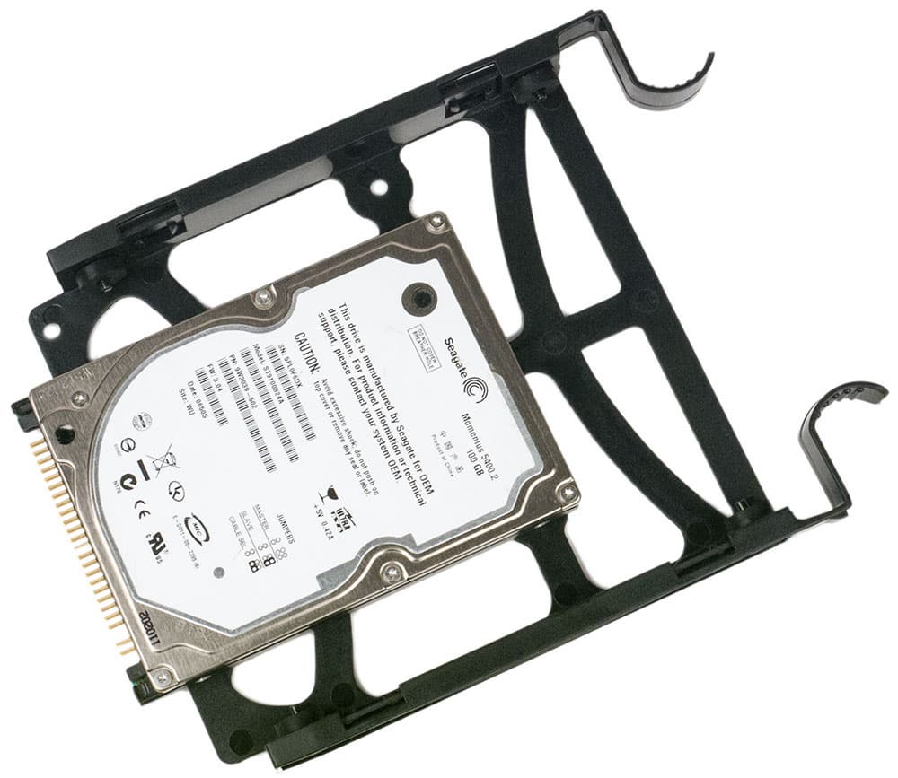 Салазки для HDD/SSD предусматривают крепление 3,5-дюймовых накопителей штифтами с боков, причем имеются и толстые трехмиллиметровые резиновые амортизаторы, а для установки 2,5-дюймовых моделей придется вооружиться отверткой: они фиксируются винтами снизу. Днище салазок ажурное, оно оставляет нижнюю часть накопителя почти целиком открытой, что важно с точки зрения охлаждения, ведь теплоотвод на шасси отсутствует.