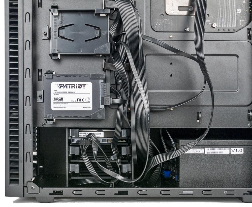 Накопители распределяются между обеими частями: в нижней есть поперечно установленная стойка, рассчитанная на три HDD/SSD любого из двух типоразмеров, а в верхней предусмотрены еще три места для крепления 2,5-дюймовых накопителей за основанием системной платы, ближе к лицевой панели.
