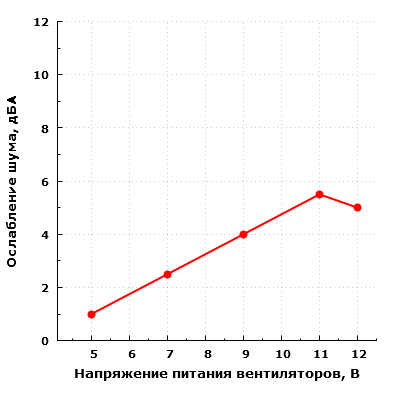 Производительность системы охлаждения корпуса изменяется в довольно широких пределах в зависимости от напряжения питания вентиляторов. Субъективно этот параметр позволяет оценить уровень шума, который находится в диапазоне от 20,5 до 37 дБА при снятой передней панели и напряжении питания от 5 до 12 В.