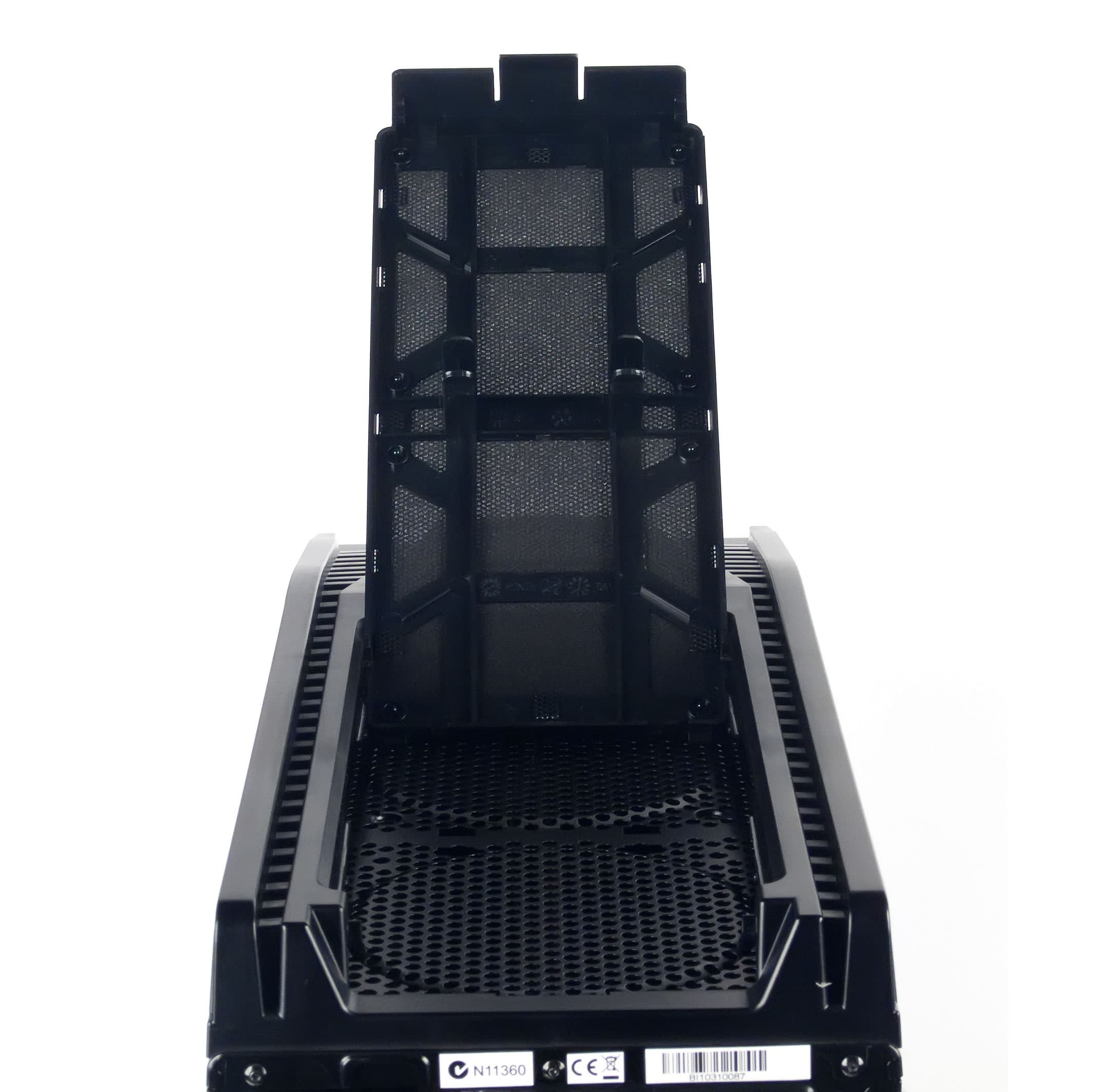 Гораздо лучше дело обстоит с рамками на нижней панели каркаса. На них установлена капроновая мелкоячеистая сетка (видимо, производитель учёл, что количество поступаемой снизу пыли будет весьма значительным и поролоновый фильтр очень быстро забьется); можно спорить об эффективности такого решения в плане «пылеулавливания», но вряд ли кто-то будет сомневаться, что такая конструкция и более долговечна, и более удобна для очистки (хотя бы под струей воды — просушить потом сеточку будет гораздо проще, чем поролоновый фильтр). Но и тут есть «ложка дегтя»: как уже было сказано, снимаются рамки внутрь корпуса, так что для чистки решетки, расположенной под блоком питания, придется снимать сам БП.
