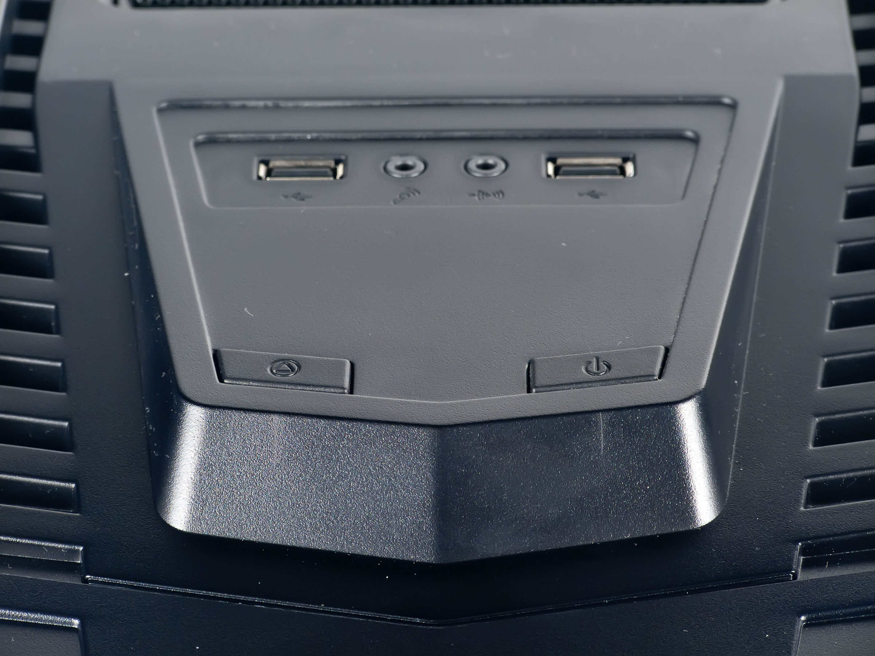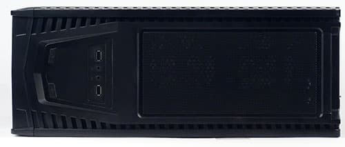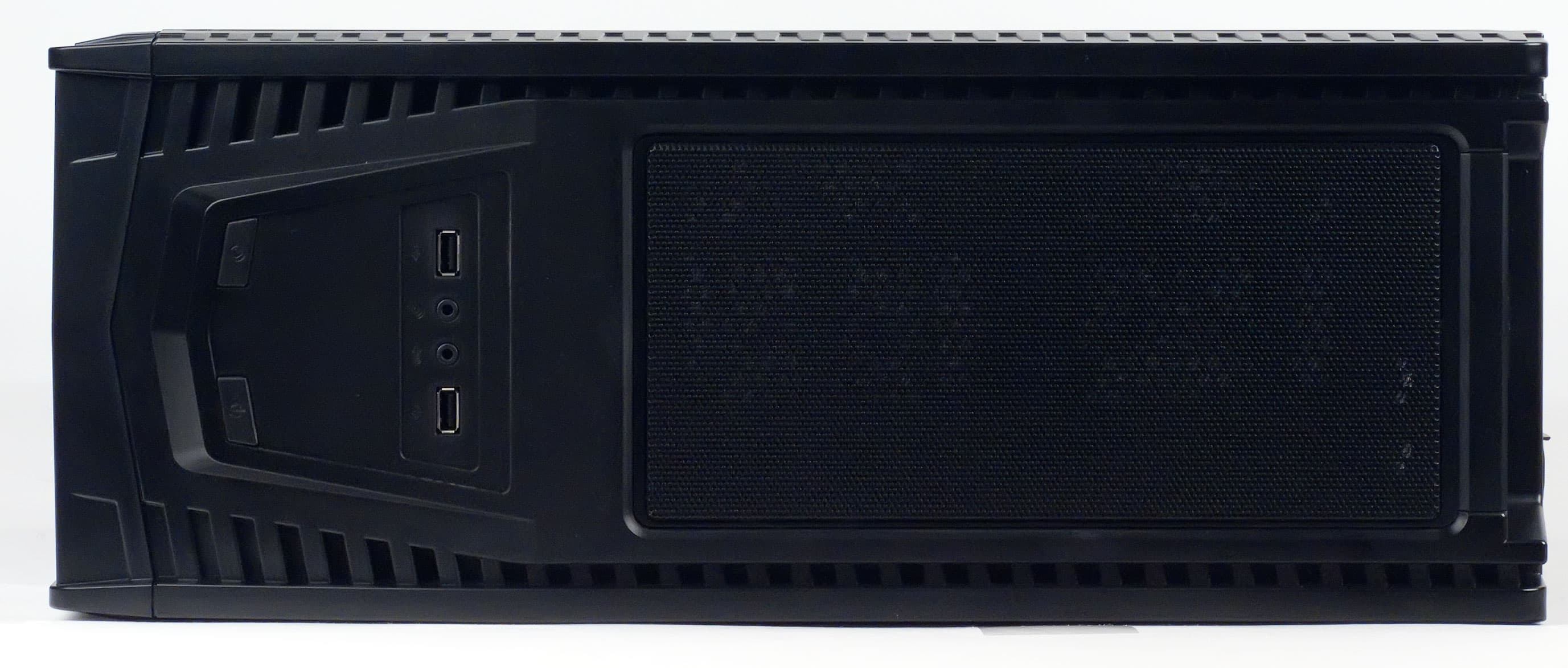 Вертикальные ребра лицевой панели имеют продолжение на верхней крышке корпуса; ее передняя треть немного наклонена вперед, а в середине расположен выступ, в верхнюю часть которого вмонтированы кнопки (включения и перезагрузки) и внешние разъемы (два USB и два аудио). Очертаниями этот выступ повторяет «геральдическую» форму вентиляционной решетки передней панели, а обрамлением его служат такие же «зубцы», и потому при взгляде как спереди, так и сверху мы видим схожую картину.