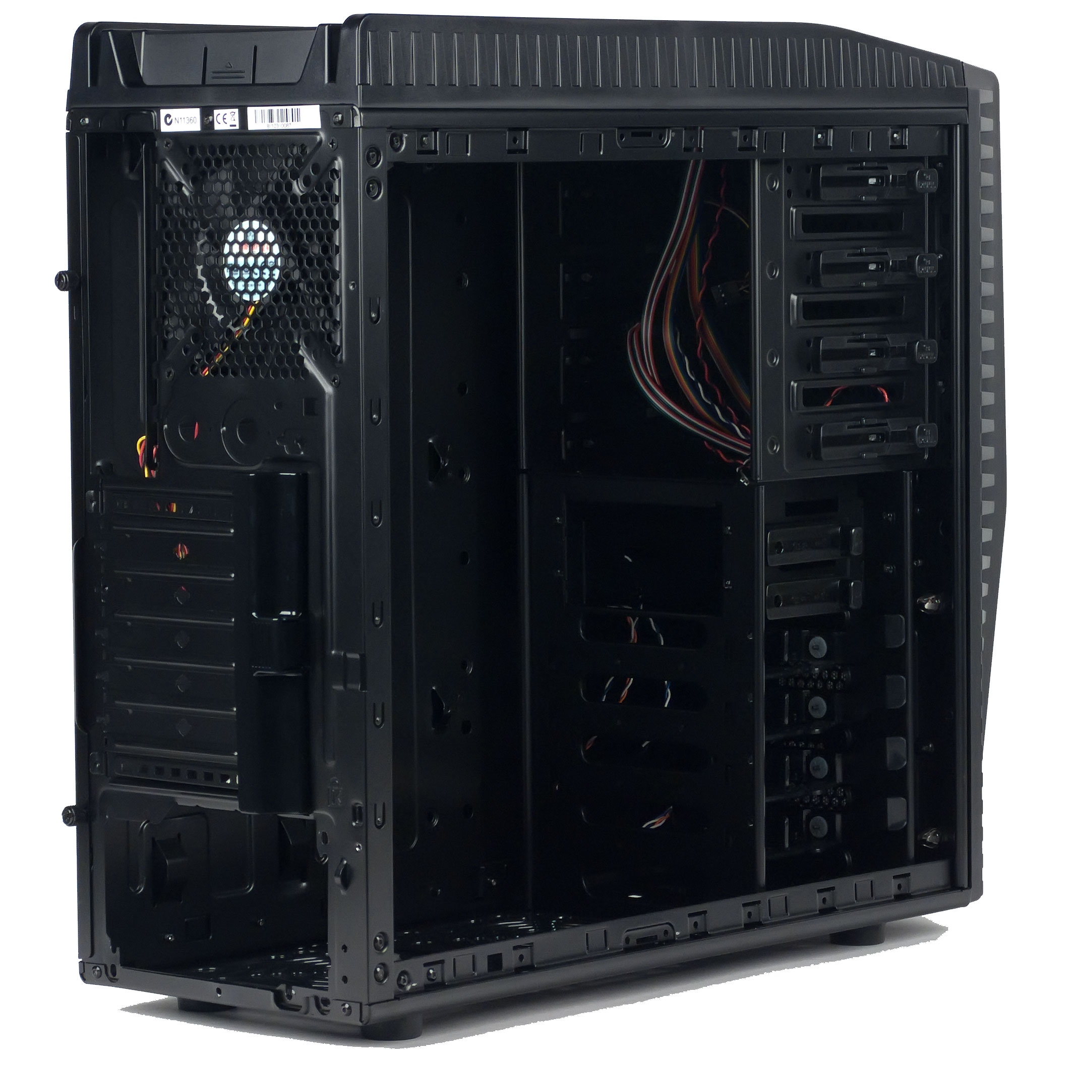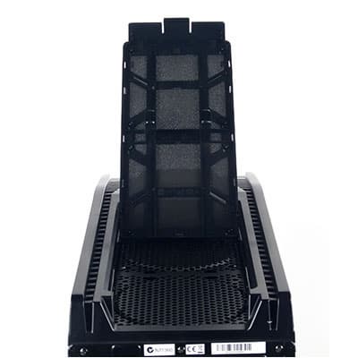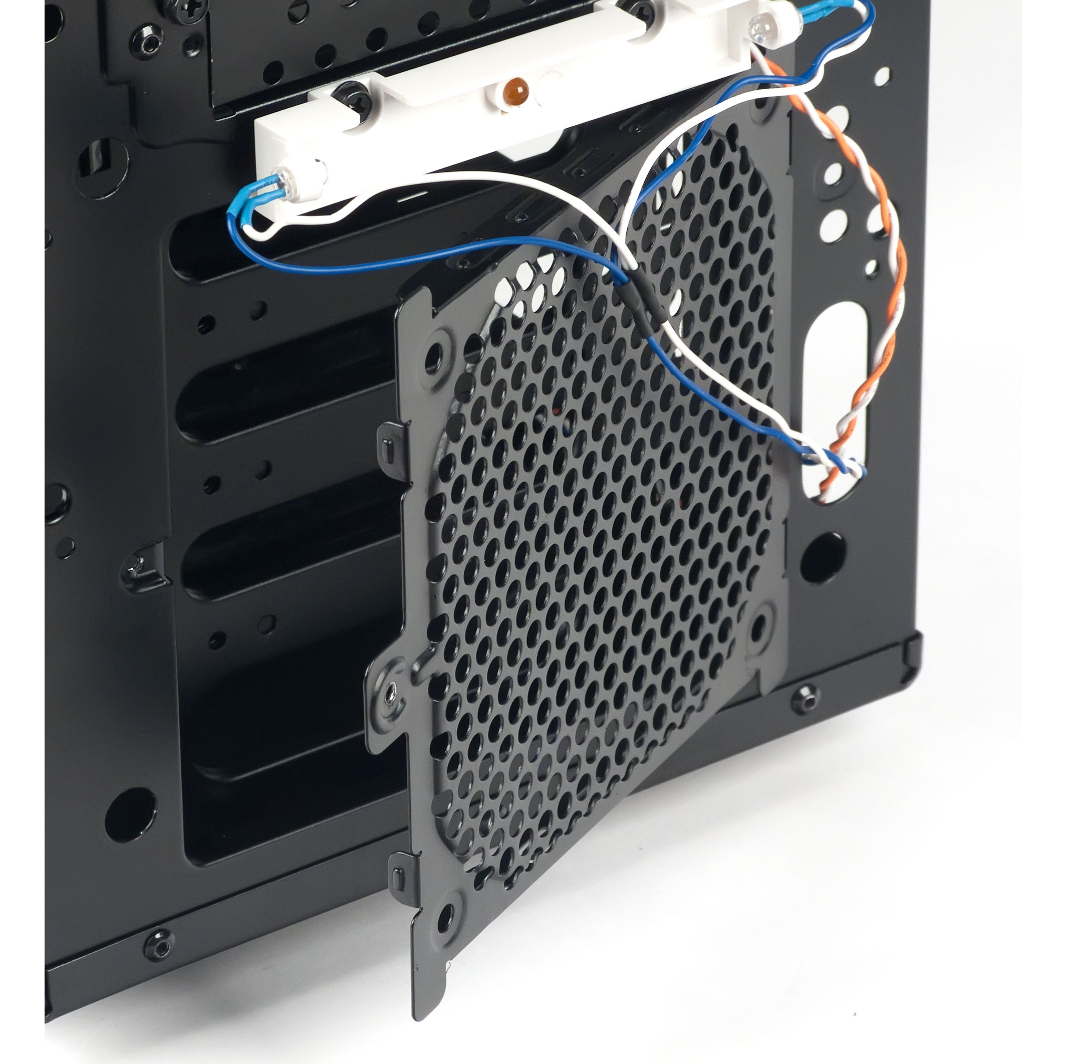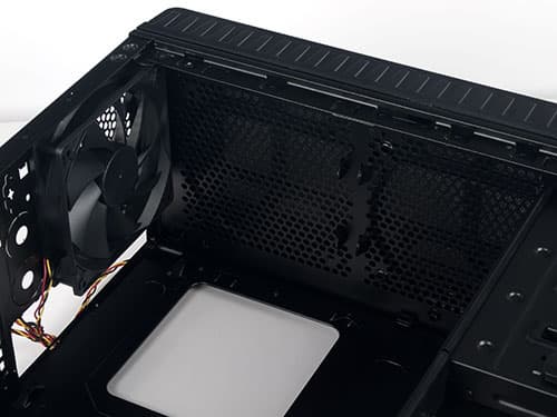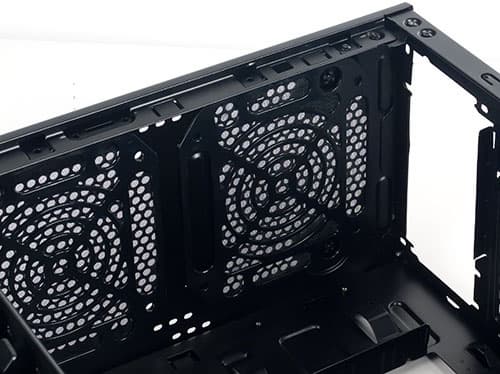 Корпус предусматривает установку до пяти 120-миллиметровых вентиляторов, не считая вентилятора блока питания; помимо упомянутой нижней плоскости каркаса, где можно установить один вентилятор, есть два посадочных места в верхней панели шасси и по одному в передней и задней. Лишь посадочное место на задней панели имеет штатные отверстия для крепления вентиляторов меньшего размера — 92 или 80 мм; при желании установить меньшие вентиляторы на прочие места вопрос их крепления владельцу придется решать самому, причем если для лицевой и верхней панелей это не составит особой проблемы (крепежный винт легко входит в отверстия перфорации, однако шаг перфорации может позволить крепление лишь в двух точках из четырех), то рамку нижней панели придется либо доработать самостоятельно, либо отказаться от идеи установить на нее вентилятор менее 120 мм.