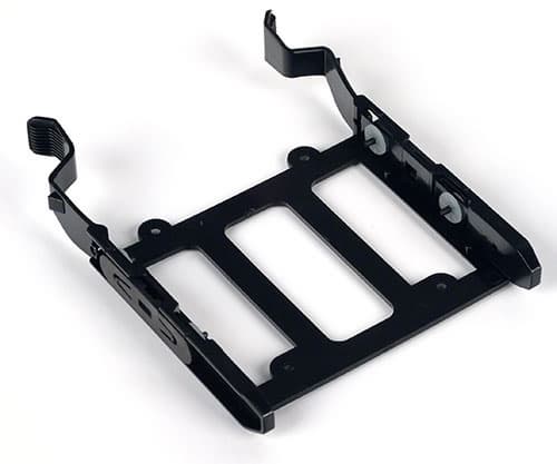 Жесткие диски устанавливаются в корзину с помощью пластиковых рамок (снимаем с рамки боковые пластинки с крепящими штырями, вставляем HDD в рамку, слегка двигаем его, чтобы он «уселся» на фиксирующие выступы, затем возвращаем на место боковые пластинки и задвигаем весь «бутерброд» в корзину); защелки рамки надежно и без заметных люфтов удерживают диск в корзине, но не затрудняют его извлечение при необходимости. Расстояние от разъемов диска до боковой крышки невелико (около 30 мм), поэтому желательно использовать SATA-кабели с Г-образными коннекторами.