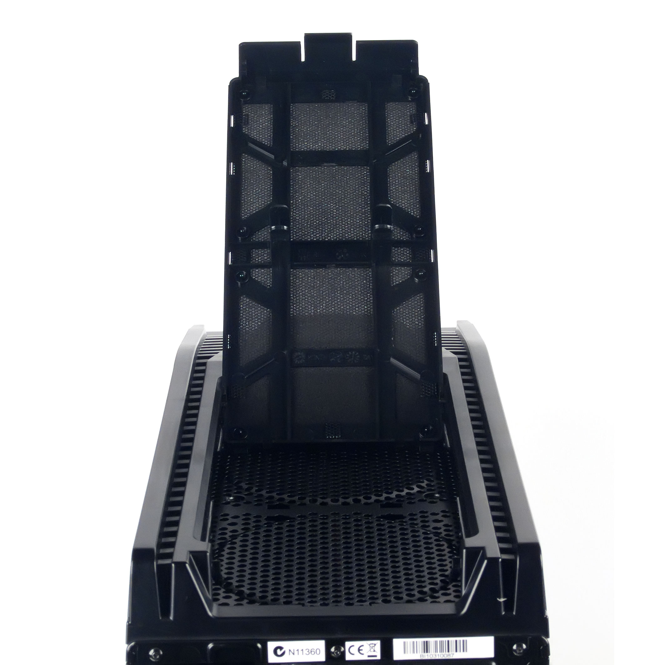 Корпус покоится на четырех круглых ножках из довольно мягкой пластмассы, неплохо демпфирующей возможные колебания. Ножки достаточно высокие, что обусловлено нижним расположением блока питания и необходимостью забора воздуха его вентилятором из-под корпуса. В нижней плоскости каркаса имеются отверстия для вентиляции в виде двух перфорированных областей, одна из которых перекрывается блоком питания (собственно, она и предназначена для его охлаждения), а вторую можно использовать для установки дополнительного вентилятора.